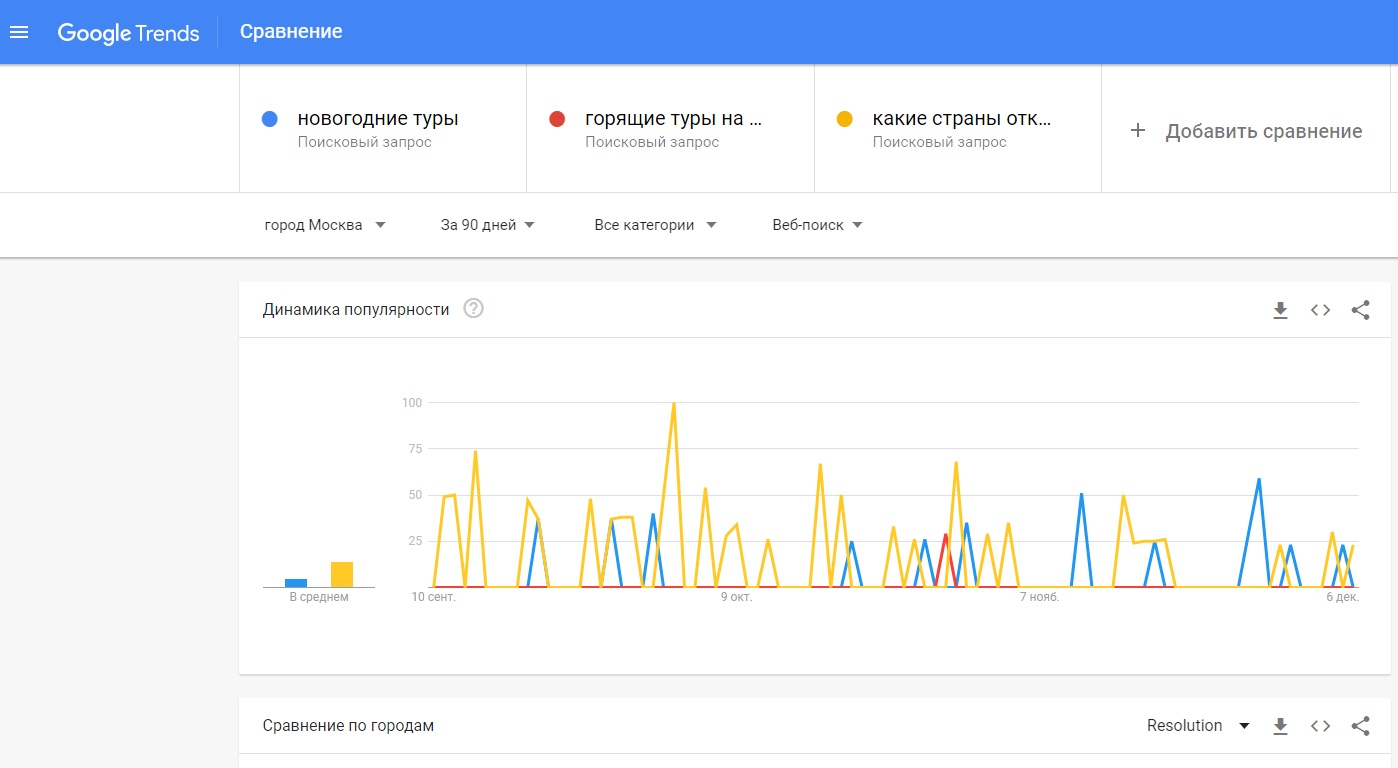 Допустим, вы ведёте соцсети турагентства. Вам надо понять, какие посты продвигать, чтобы они привлекли внимание покупателей. Вы сравниваете три запроса: «новогодние туры», «горящие туры на Новый год» и «какие страны открыты». На графике они помечены разными цветами: